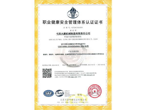 公司順利通過質量管理體系認證、環(huán)境體系認證、職業(yè)健康安全管理體系認證、環(huán)評。2015年5月獲國家工信委頒發(fā)的《鑄造企業(yè)準入條件》;2019年做了安全現狀評價;2020年取得了排污許可證。
